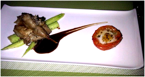 Confit of quail – Asparagus, quail egg in slow cooked roma tomato, chocolate sauce