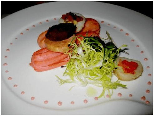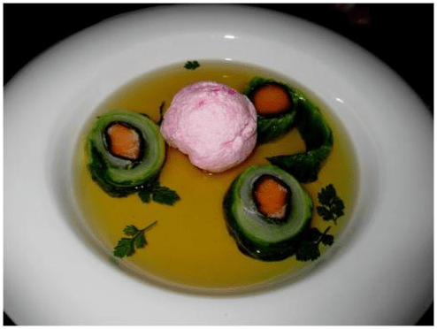The chicken consommé was ok, but clear soups like beef or chicken consommé usually don’t impress me much. The salmon wrapped with vegetables was weird, but still not disgusting. The “pink floating island’, whatever it was, was terrible. It was tasteless and useless. I would have preferred candy floss or marshmallow.