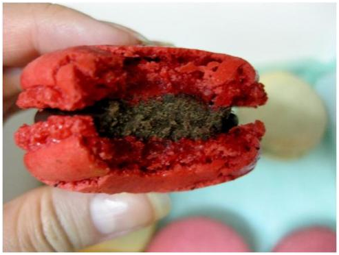 Rum soaked cherry in the centre! The blackforest macaron is really good! No sickeningly sweet aftertaste and it’ll make you crave for more after the first bite. Amongst the 5 flavours available, balckforest was the better one.