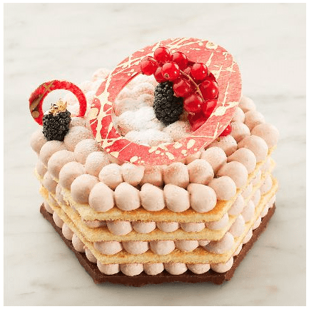 “Earl grey-infused strawberry mousse between layers of chiffon sponge sits ever so lightly on a royaltine chocolate base.”