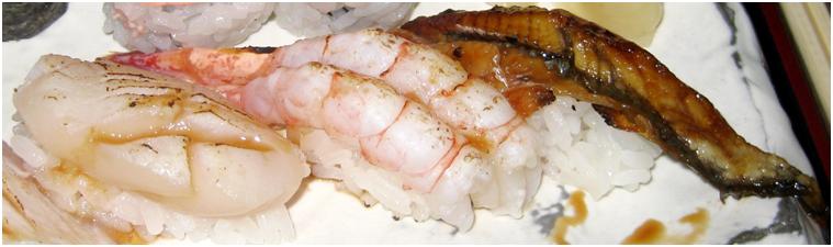 The seafood: Scallop, Amaebi (sweet prawn), Unagi (eel)