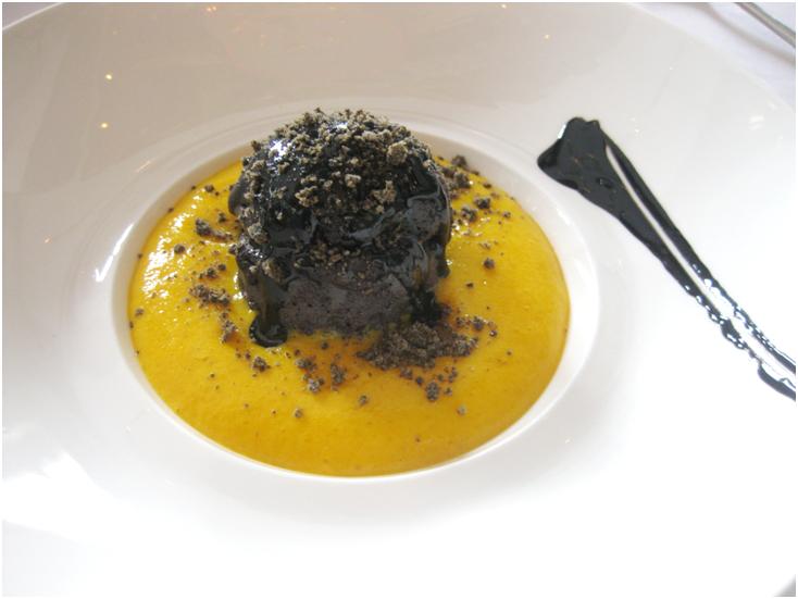 This was my first time trying a combination of black sesame and mango and it actually went quite well. The meringue was like a semi solid which disintegrated when I scooped it with my spoon. The centre was filled with strawberry ice cream which also went well with the black sesame and tangy mango crème. As much as I liked this dessert, I was more fascinated with the one my dining partner had.