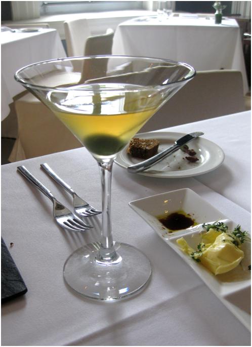 This drink was served together with the Joselito Iberico Ham, with an olive in it.