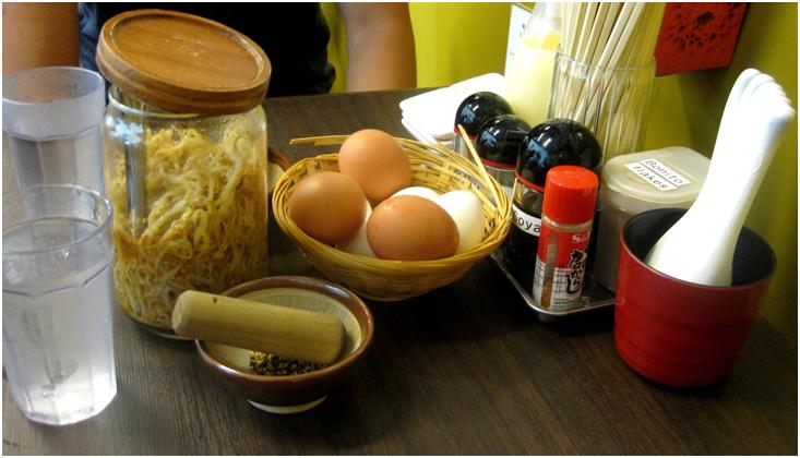 Condiments are free flow. Bean sprouts, boiled eggs, bonito flakes, mayonnaise etc.