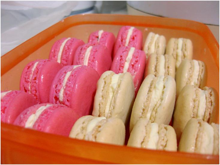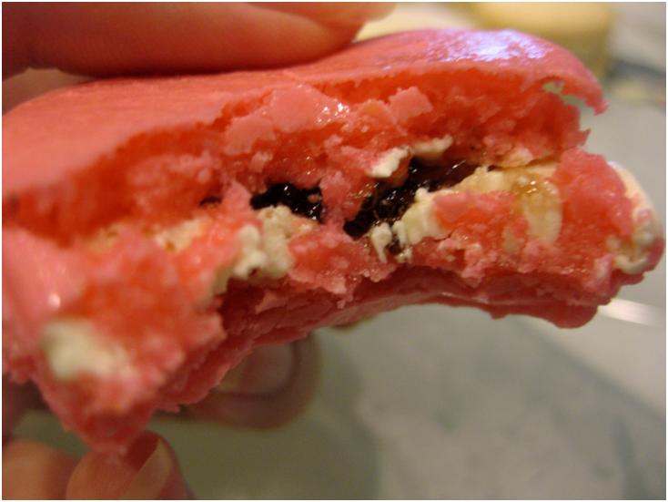 The macaron shell turned out almost perfect. It had a flat top but with frilly feet. The inside was really full and chewy and didn’t have hollow area.