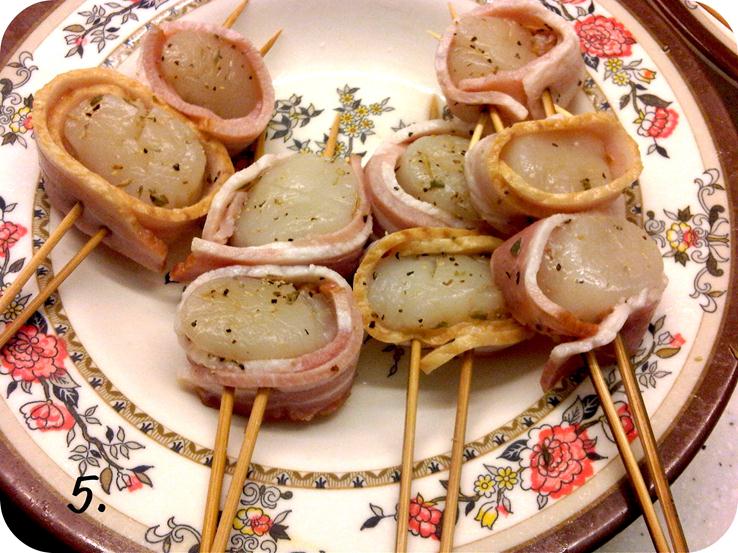 - For the scallops, cut the streaky bacon into half horizontally. Wrap half bacon around each scallop.