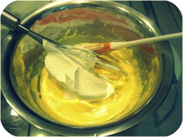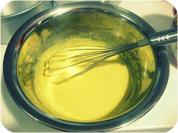 - Over steam, whisk egg yolks and sugar until pale. This takes about 5 to 10 minutes. Let it cool.