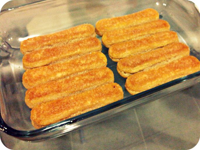 - Lay a layer of dipped savoiardi onto the container. Pour half of the mascarpone mixture onto the layer. Repeat.