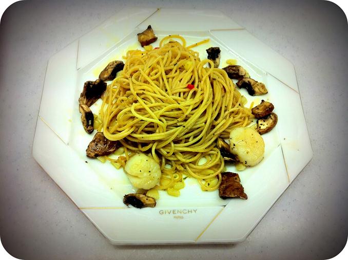 Wholewheat spaghetti aglio olio with sautéed Portobello and scallops