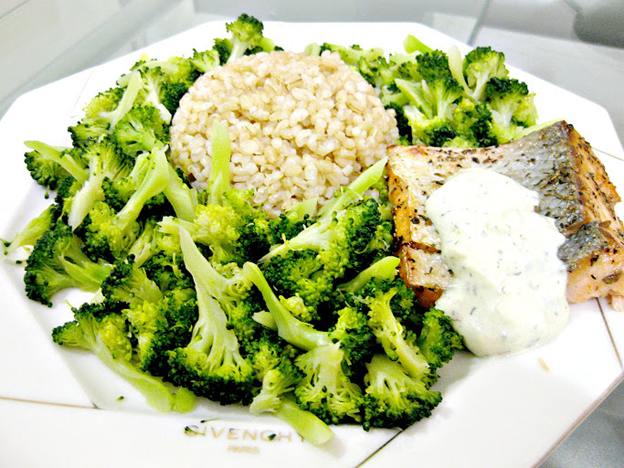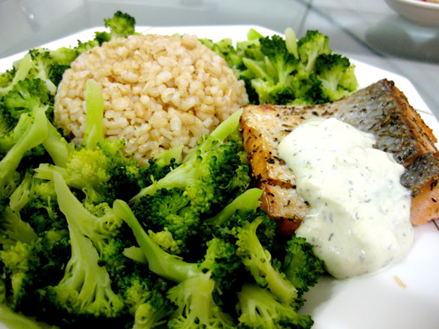7. Oven Grilled Salmon with Sour Cream Dill Sauce, Steamed Broccoli and Brown Rice