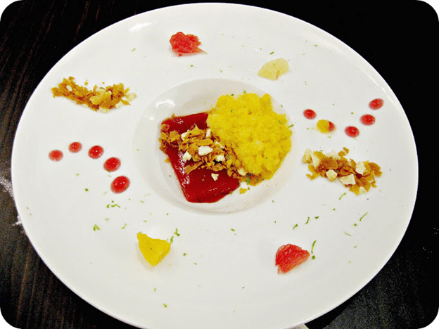 As the name suggest, it is a very citrusy dessert and there are many textures. The yellow mass is crushed ice and the red portion is a slab of jelly. Mix it together with the corn flake like flake, lime zest and the citrus fruits, you’d get a bursting flavour of citrus in your mouth combined with many textures.