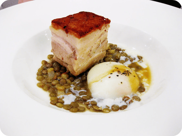 Crispy Pork Belly with Poached Eggs and Diced Vegetables – $10.90++