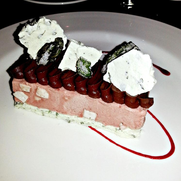 Raspberry parfait, chocolate cream, basil meringue – $14.00++