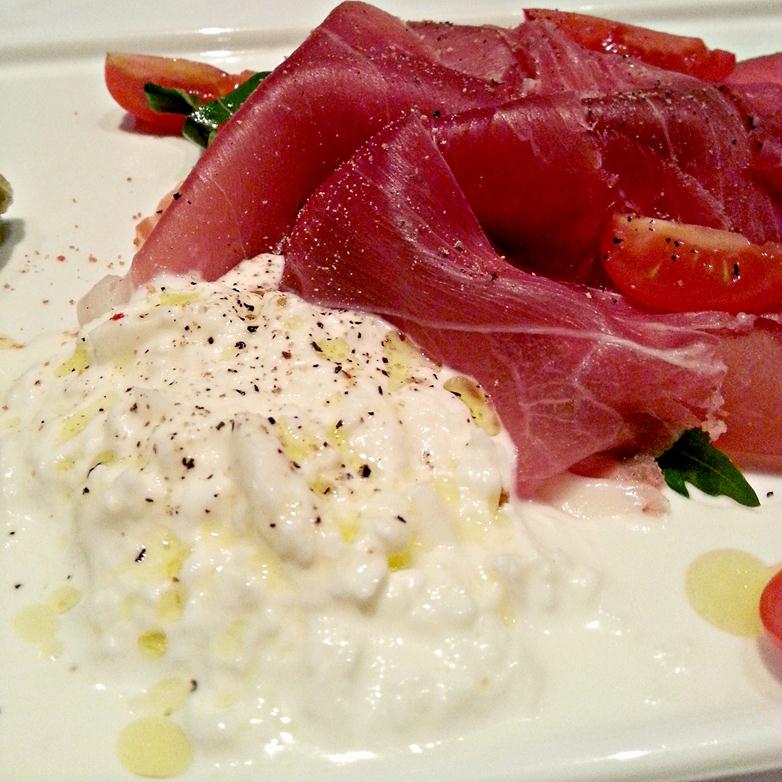 Ripe Italian tomato, Burratina cheese and Pio Tosini Parma ham