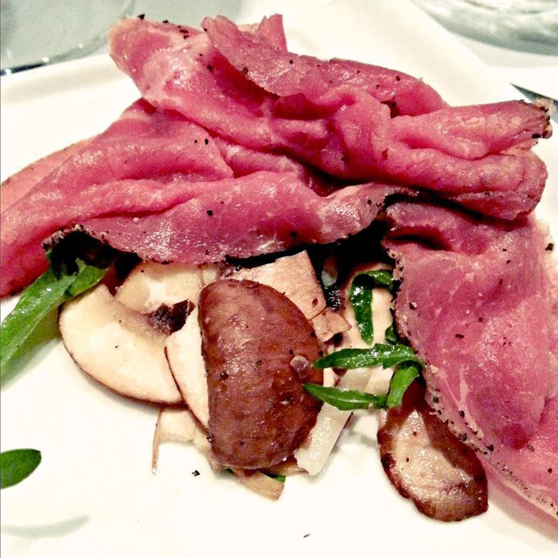 Wagyu beef carpaccio with mushroom and parmesan cheese salad