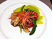 Pan-Roasted Red Snapper, Root Vegetable & Herb Salad, Raspberries Dressing, Grilled Enoki, Green Pea Coulis