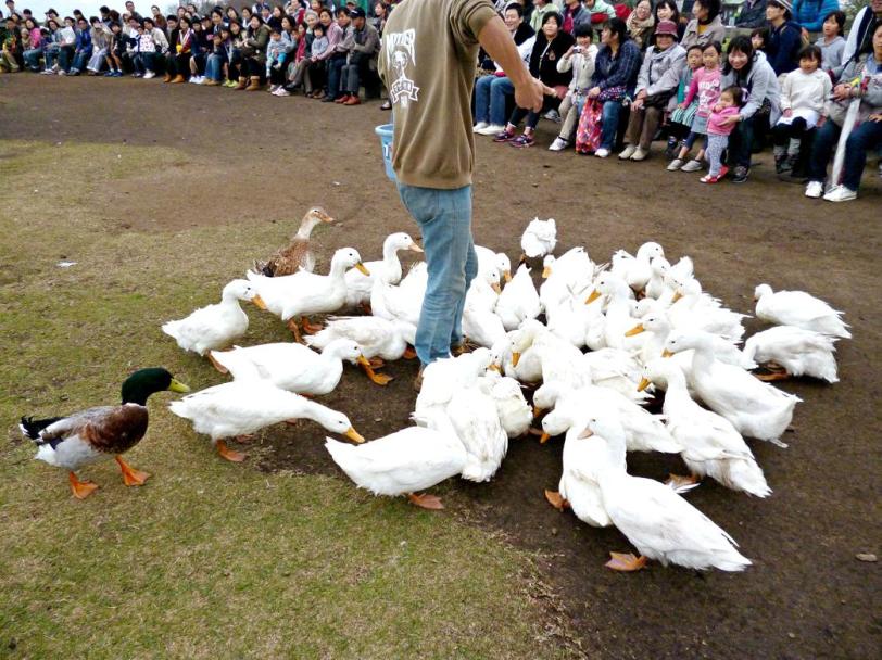 The 2 different coloured ducks are normally slow and lazier than the white ones! They also seem to stick together like they are friends. The show lasted about 15 minutes.