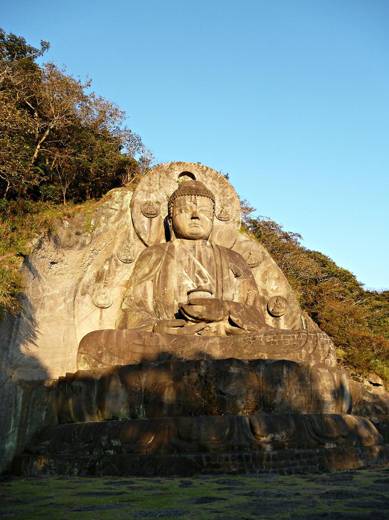 The western side of the mountain is also the site of the sprawling Nihon-ji temple complex, which is the home of two Daibutsu sculptures – a huge seated carving of Yakushi Nyorai that at 31.05 metres (101.9 ft) tall is the largest pre-modern, stone-carved Daibutsu in Japan, and the “Hundred-shaku Kannon”, a tall relief image of Kannon carved into one of the quarry walls – as well as 1500 hand-carved arhat sculptures, which combined with the spectacular scenery of the Bōsō Hills and Tokyo Bay, make Mount Nokogiri a popular tourism destination.
