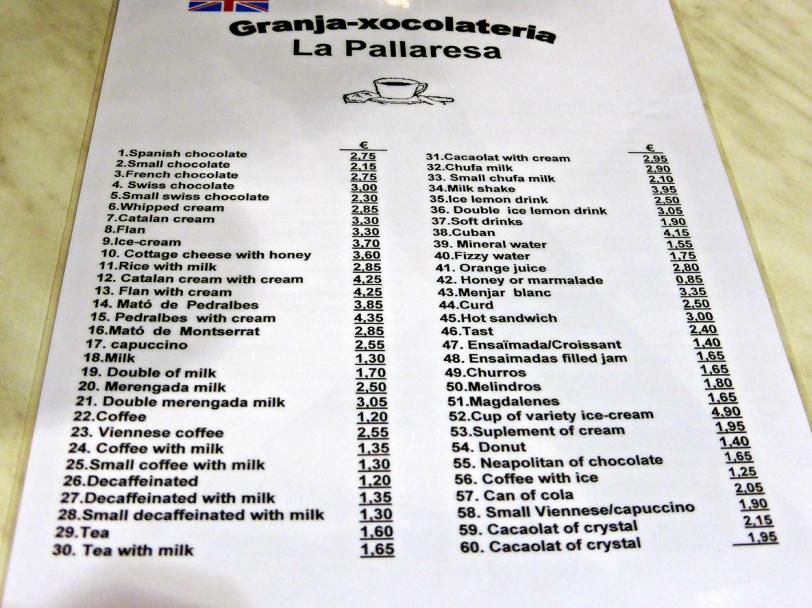 The menu is so extensive with 60 items but a bit too messy. Here they have 3 types of hot chocolate – Spanish, French and Swiss. Since we’re in Spain it’s obvious which I chose.