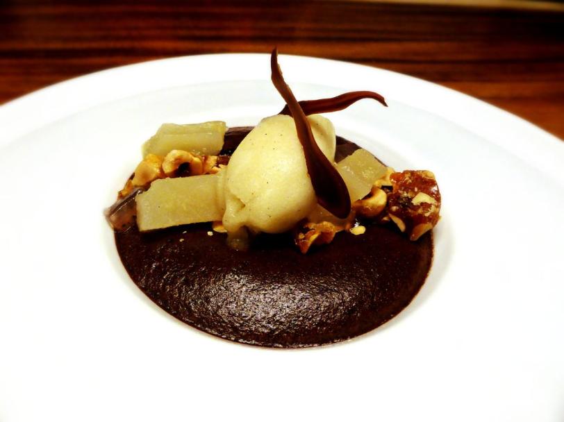 Baked chocolate mousse, hazelnut praline, pear sorbet, capovilla eau de vie – $12.00++