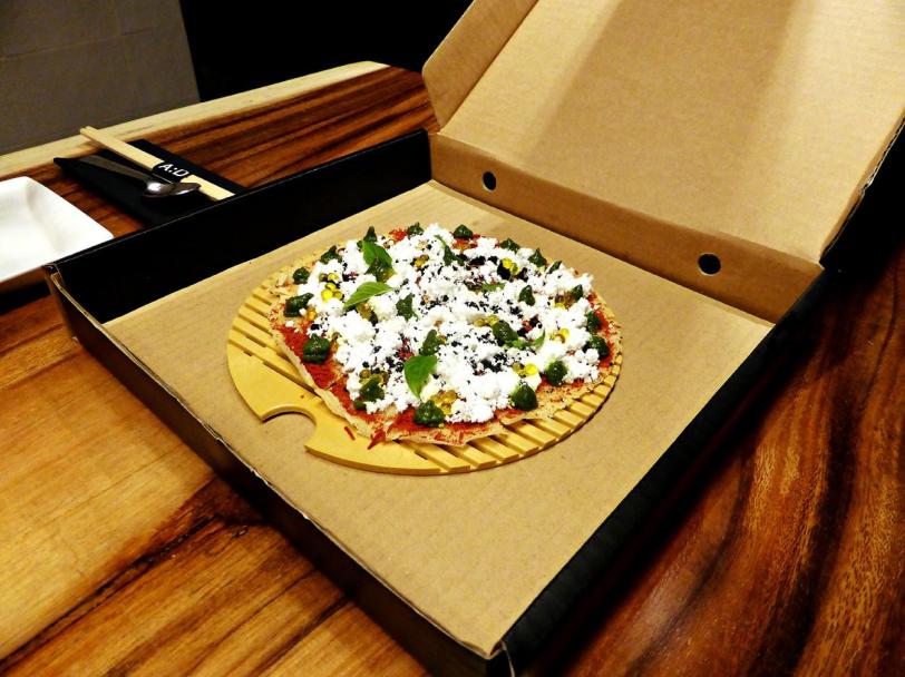 Crisp parmesan pizza, olive oil caviar, powdered tomato, pesto, basil cress – $12.00++