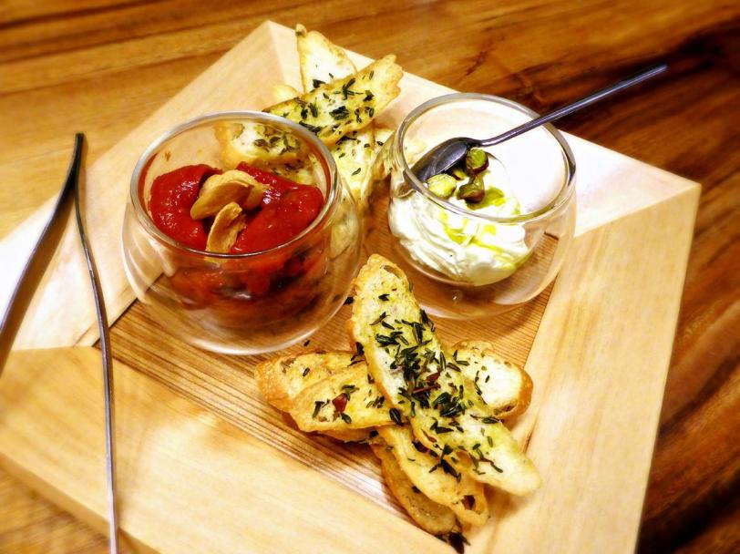 Roasted bell peppers, pistachio cream, thyme crostinis – $8.00++