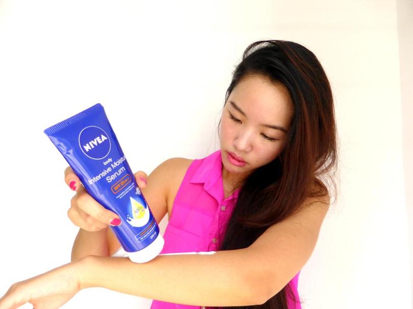 I wear sleeveless clothing every single day because I have an irrational fear of long sleeves. I don’t like the idea that I cannot remove the sleeves when it feels warm outside. Even if it was cold, I still would never wear long sleeves. I am not kidding. As a result, my arms are always exposed so here I am happily (and looking serious because it is important) applying the NIVEA Body Intensive Moisture Serum SPF 25 PA++ onto my arms.