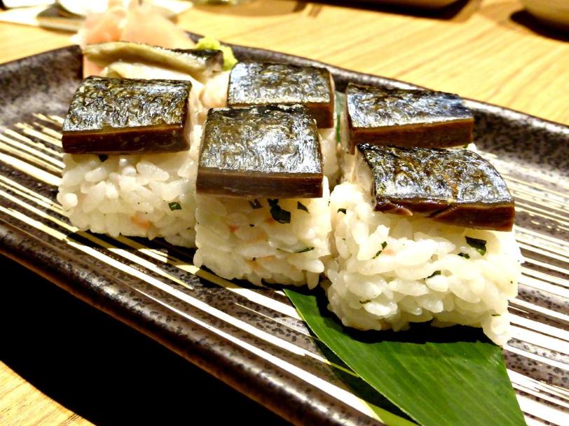 This looks like Osaka style hako-zushi (box sushi) to me. The rice is not just plain rice, but seasoned with ginger inside. The fish was cooked somewhat like aburi style. Nothing went wrong with this one.