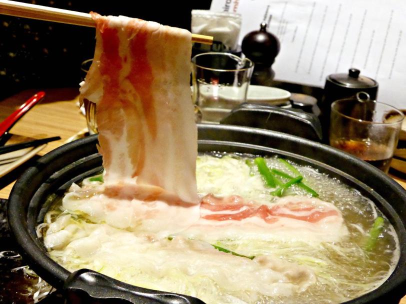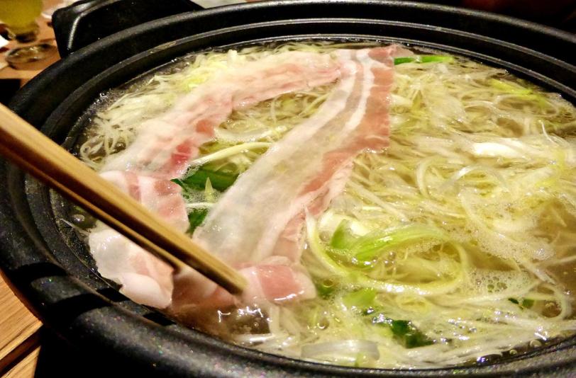 The collagen will go into the chicken soup first, and then the leek. The kurobuta pork slices are to be cook laid flat, and flipped over for even cooking. It isn’t meant to be like the usual steamboat style were you dip it into the soup.