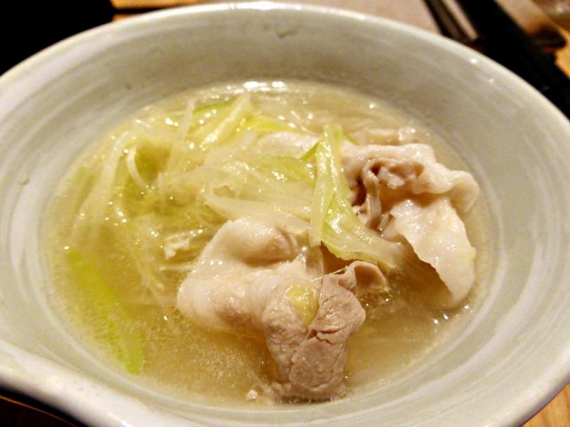 The pork was very tender due to good meat quality and because of how thinly it was sliced. It paired well with the leak. It was towards the bland side because the soup was very light to begin with.