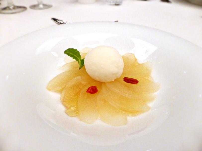 Japanese pear compote with jasmine jelly and amaretto ice cream