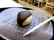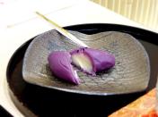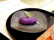 This is one of the seasonal wagashi shaped to look like purple sweet potato.