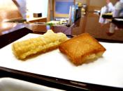 Tofu appetiser was served. Behind are the dipping options for the tempura – they provided dashi sauce, salt and matcha salt. The chef would suggest which to use upon serving each course. I personally find matcha salt kind of gimmicky.
