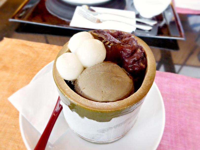 Houjicha ice cream with jelly, adzuki and shiratama dango just because during the tea ceremony I already tried the green tea jelly. While this was nice, the green tea version was better. I can understand why everyone is ordering the green tea jelly – because it is really the best! Anyway the jelly though in houjicha flavour was still as soft and good.