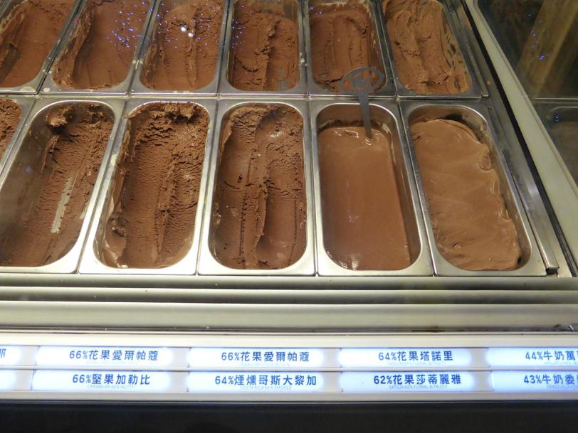 They have 17 types of chocolate ice creams using chocolate from various origins, as well as an equal number of tea ice cream flavours, mostly Chinese teas and tea blends. Taiwan is known for their locally produced fruits and on the menu there are equally many unique fruit flavours too. Ice cream goes for 90NT, 150NT and 225NT for single, double and triple scoops respectively and they all come with toppings. For my triple scoop, I get 4 toppings. The variety of toppings are not the usual either. You can get pineapple pastry or cheesecake as toppings – both sold at their shop, and this is a good way to sample their products before buying.
