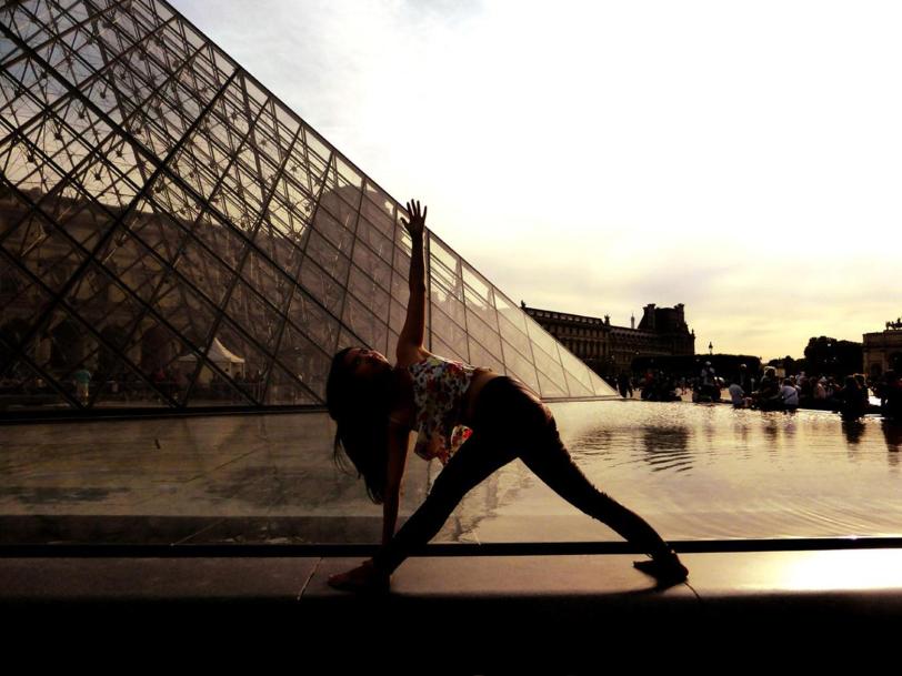Revolving Triangle Pose, Parivrtta Trikonasana in front of the Louvre