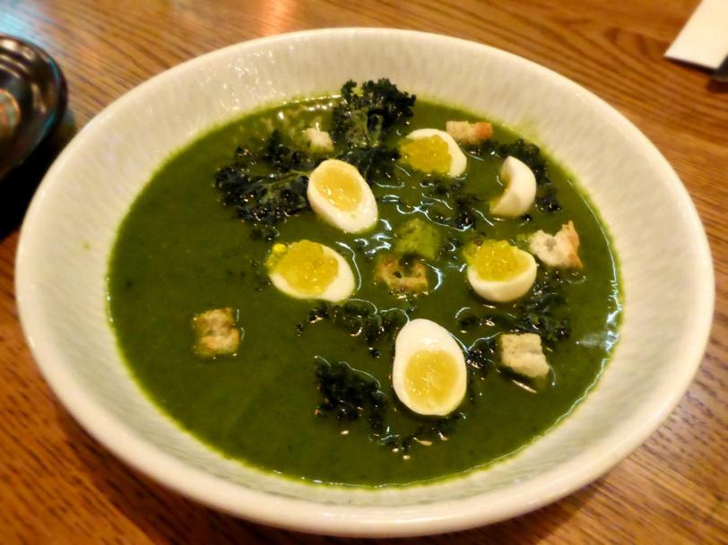 Kale broth, crispy kale & smoked quail eggs – $18.00++