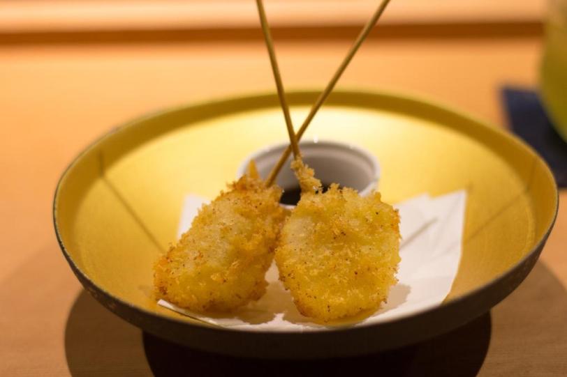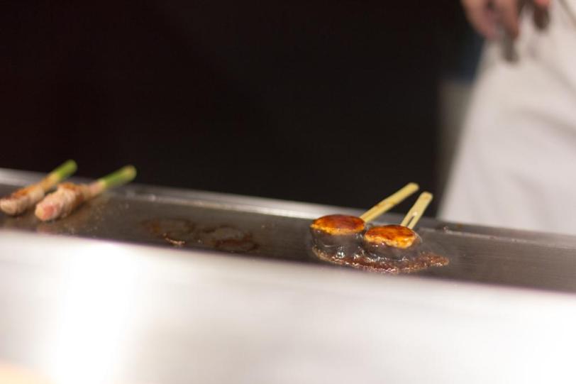 It’s way more common to see skewers cooked robatayaki style (over charcoal grill) or deep fried (Osaka style). I’ve never had skewers cooked on a hot plate (teppan) and certainly never imagined that it could be part of a Kaiseki meal before today.