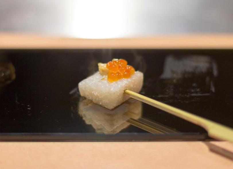 The konnyaku (konjac) cake was had fish roe inside and was grilled (still piping hot as you can see from the smoke) over the teppan before added the toppings of salmon roe and mustard. Konnyaku is common in Japanese cuisine based on my experience in Japan.