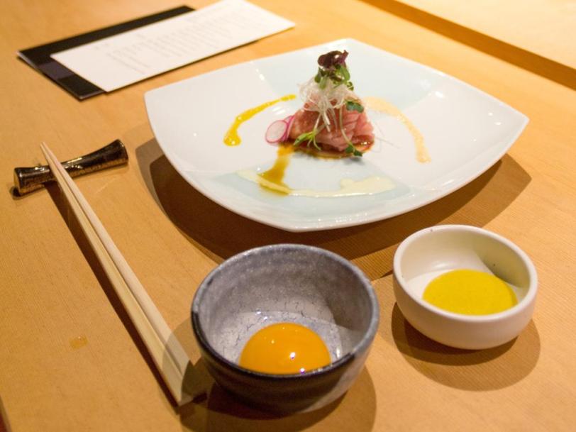 Raw dish: Toro fatty tuna with fresh egg yolk