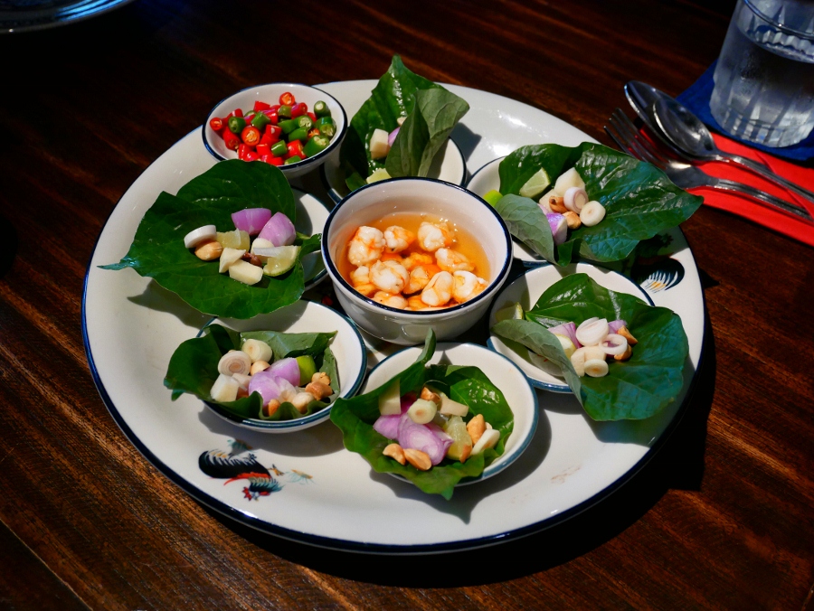 Betel Leaf Wrapped with Herbal Condiments and Shrimp in Sweet Clear Sauce ฿180