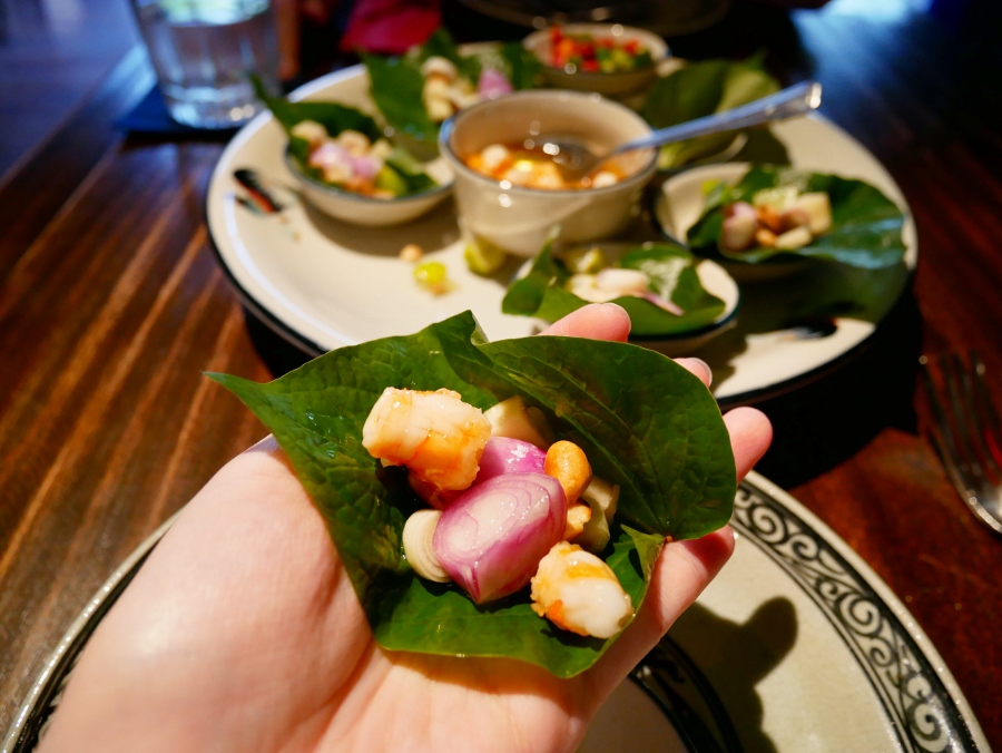 Betel Leaf Wrapped with Herbal Condiments and Shrimp in Sweet Clear Sauce ฿180